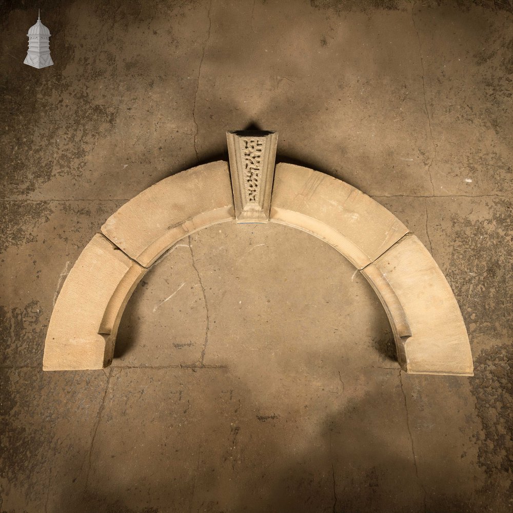 The surface shows natural weathering and original tooling marks. The chisel lines remain visible, and the joints sit tight. The keystone sits deep and slightly tapered. Hand carved geometric detail draws focus to the centre. Late nineteenth century with Neo Gothic influence. Excellent reclaimed condition with light age wear. Dry laid for display and ready for professional installation.
