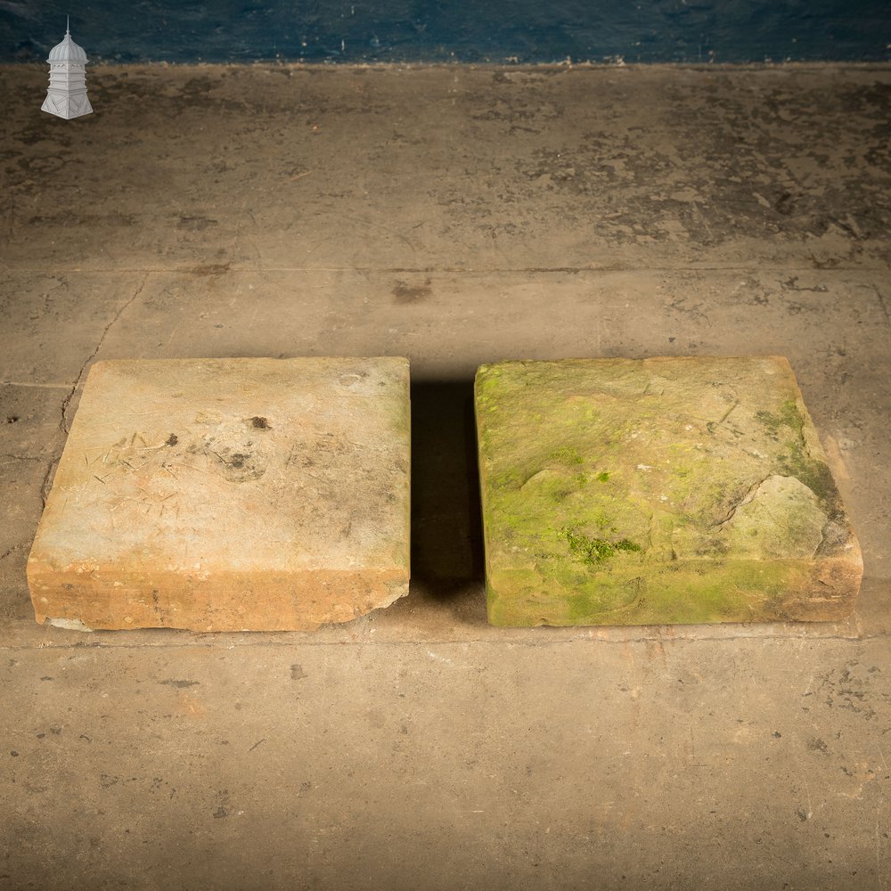 A pair of reclaimed sandstone '4-way weathered' pier caps. Both are well weathered and worn, with no drip channels on the underside. Please see images for condition.