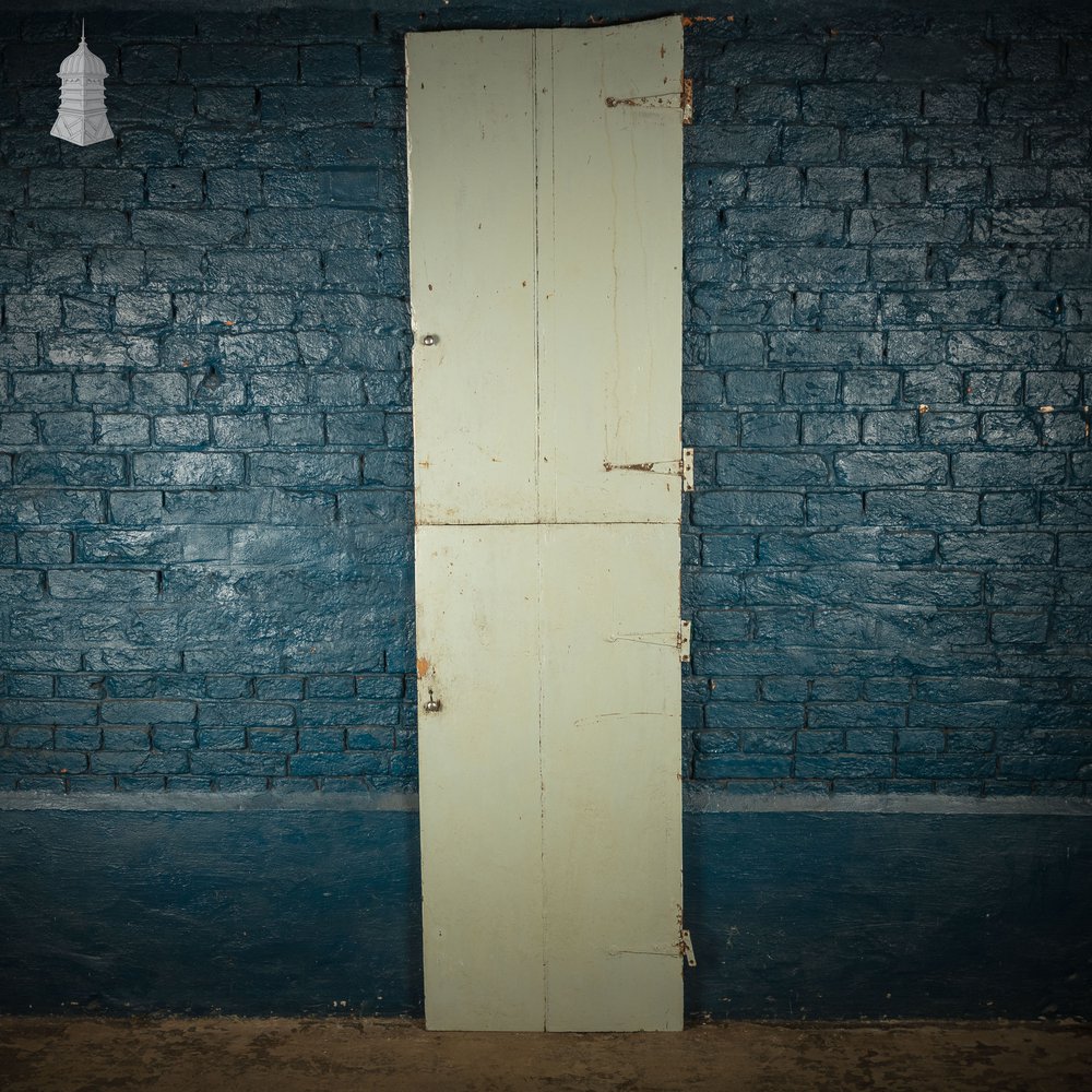 A pair of reclaimed painted pine cupboard doors in a plank and ledge style. Showing age and wear