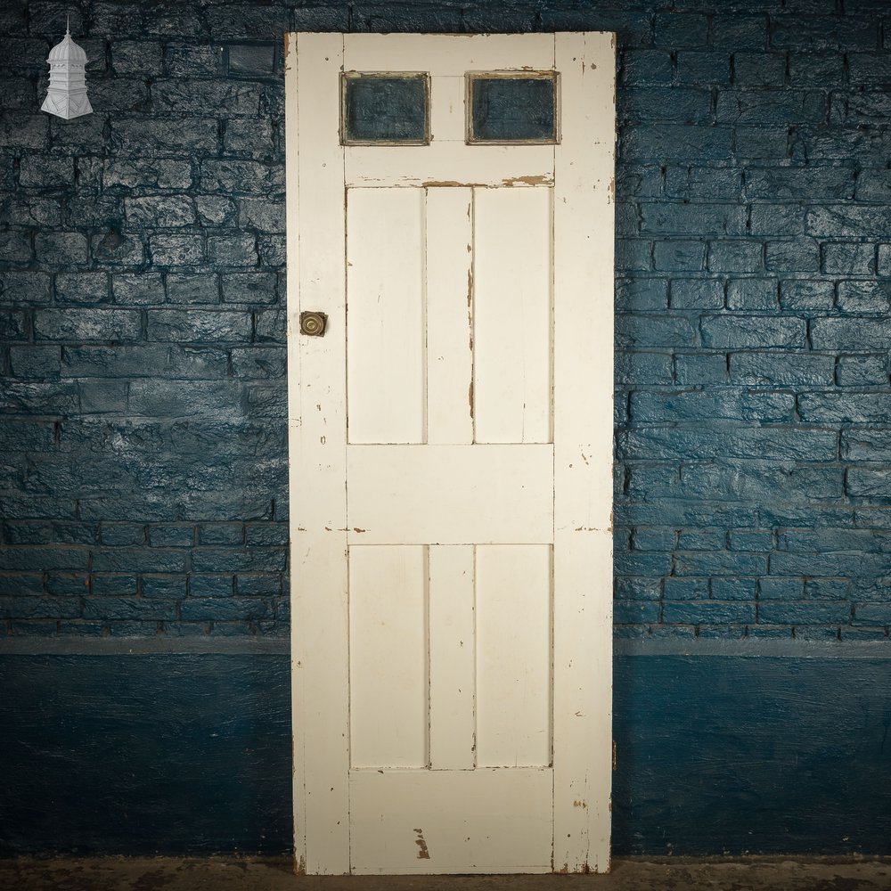 A part-glazed 6-panel door with white distressed paint on both sides. The panels have moulding on one side. The paint is flakey, showing clear signs of age and use. The door retains its original handle and hinges. The 6-panel layout has two small upper glazed panels above two pairs of vertical solid panels below. See images for condition.