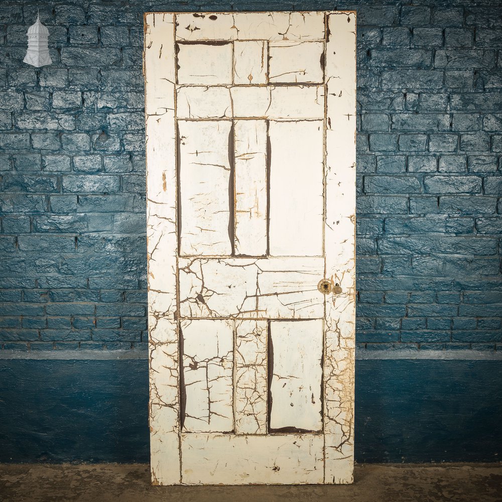 A shaker style 6-panel door with distressed white paint on both sides. The paint is flaky with a crackled finish. Some hardware remains, including hinges, a finger-plate, and a lock, and holes show where other fittings were removed. The 6-panel layout has two small upper panels above two pairs of vertical panels below. The condition is typical for the age and previous use of the item. Please see the listing images to assess the condition for yourself.