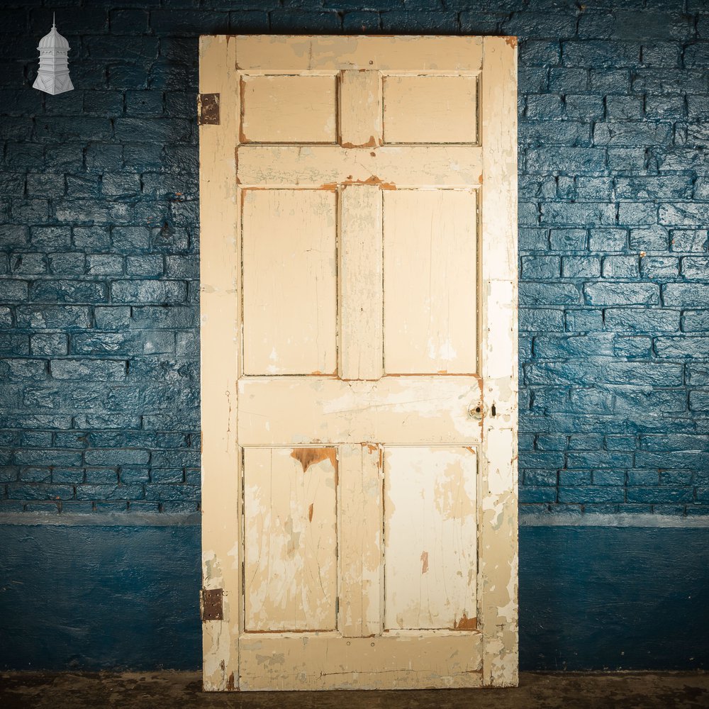 A reclaimed moulded 6 panel door with a classic balanced layout. Hinges present, lock and handles not included. Holes remain from removed hardware. Distressed cream and white paint finish. Knocks, scuffs and wear in keeping with the age of the product. Check listing images for condition.