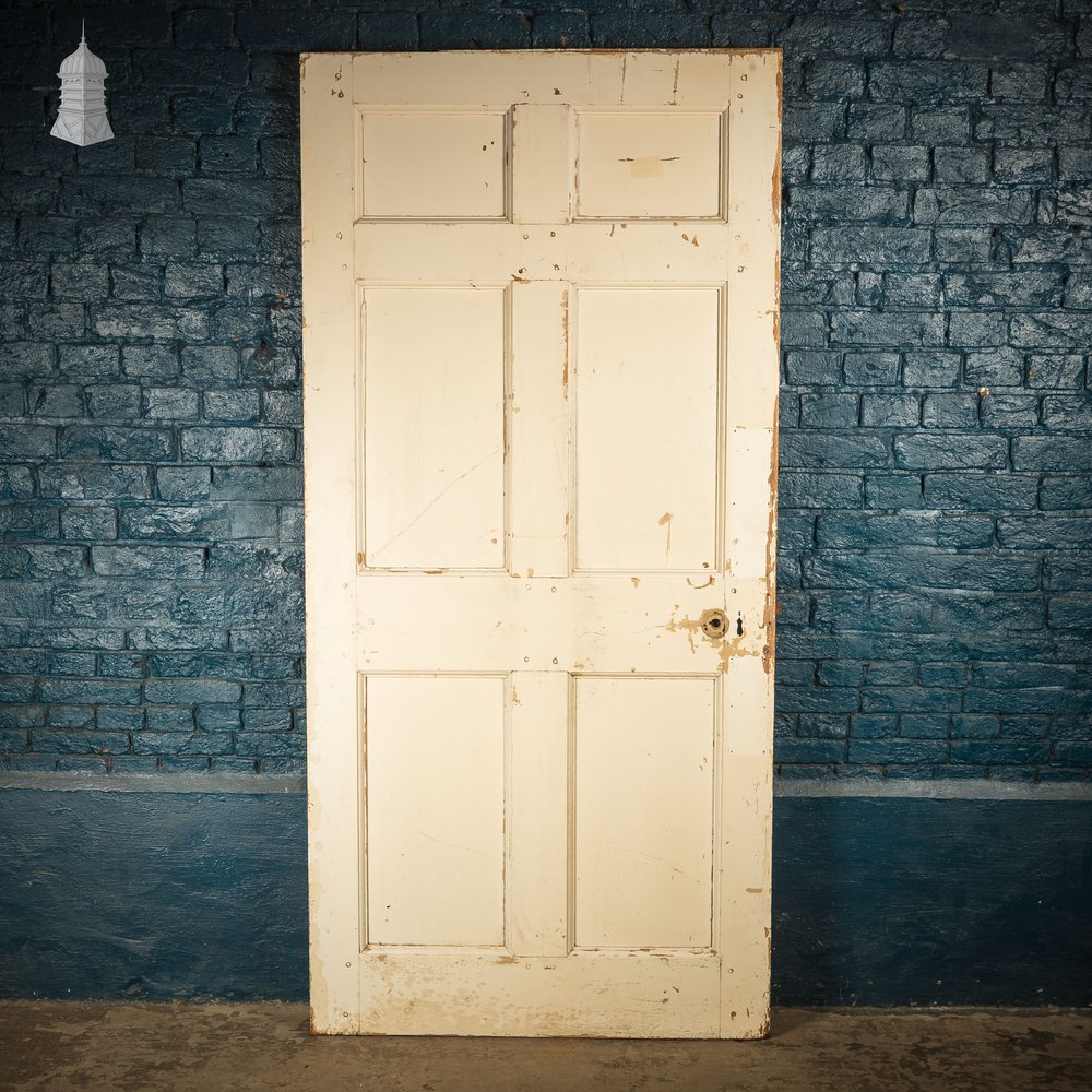 A reclaimed moulded 6 panel door with a classic panel layout. Lock present, hinges and handles not included. Holes remain from removed hardware. Distressed white on one side and brown on the reverse. Knocks, scuffs and wear in keeping with the age of the product. Check listing images for condition.