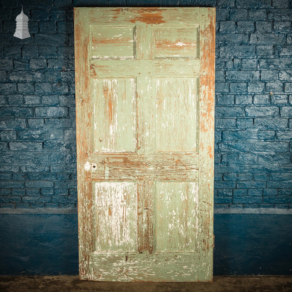 A reclaimed moulded 6 panel door with a classic balanced layout. Hinges present, lock and handles not included. Holes remain from removed hardware. Distressed white and green on one side with a blue reverse. Knocks, scuffs and wear in keeping with the age of the product. Check listing images for condition.