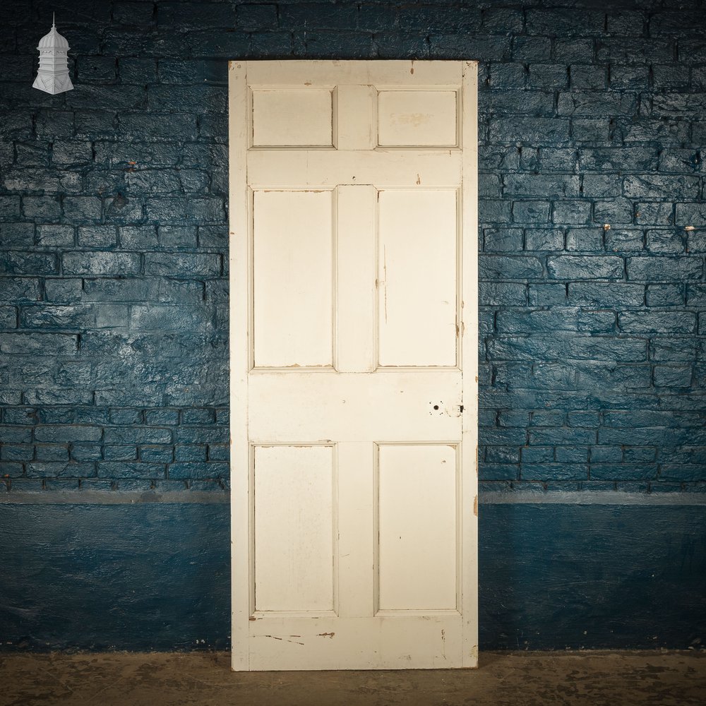 A reclaimed moulded 6 panel door with a typical six panel layout. Hinges, lock and handles not included. Holes remain from removed hardware. Painted white finish. Knocks, scuffs and wear in keeping with the age of the product. Check listing images for condition.