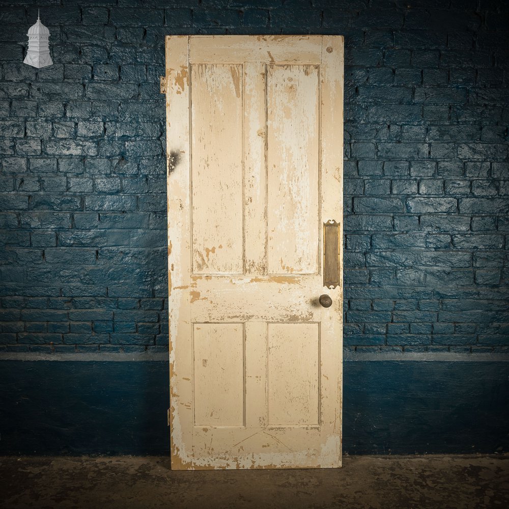 A moulded 4-panel door with a distressed cream paint finish. The brass finger-plate, hinges, and handle are still attached. Check images for condition.