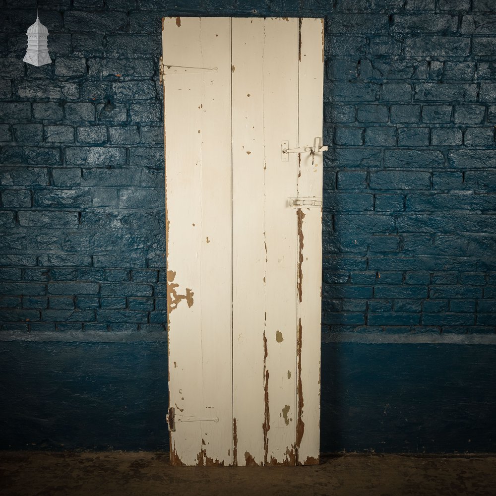 A reclaimed plank and ledge door. Latch and hinges present. Distressed white paint finish. The thickness given is measured at the ledge. Wear including knocks and scuffs is consistent with age. Please use the listing photos to assess condition of this reclaimed item.