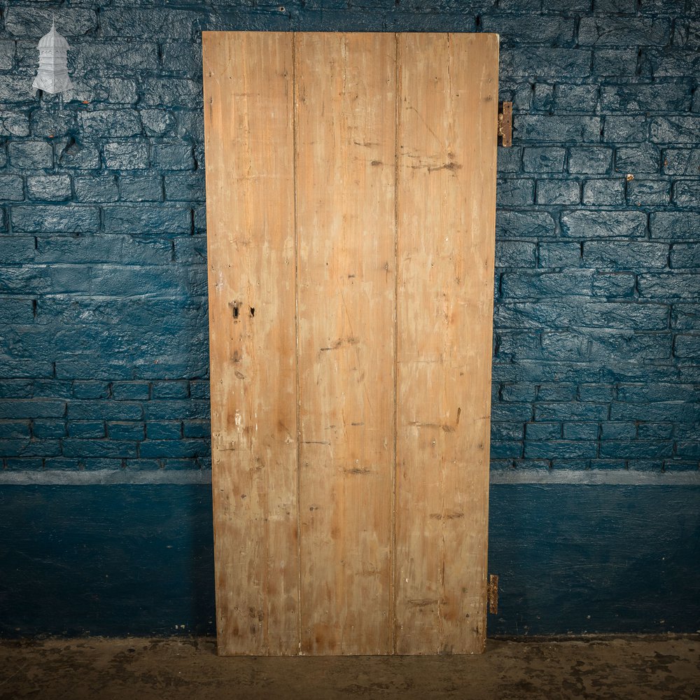 A reclaimed 3 plank door with ledged supports. Hinges present, latch not included. Holes from removed hardware are present. Unfinished or stripped pine. The thickness given is measured at the ledge. Wear including knocks and scuffs is consistent with age. Please use the listing photos to assess condition of this reclaimed item.