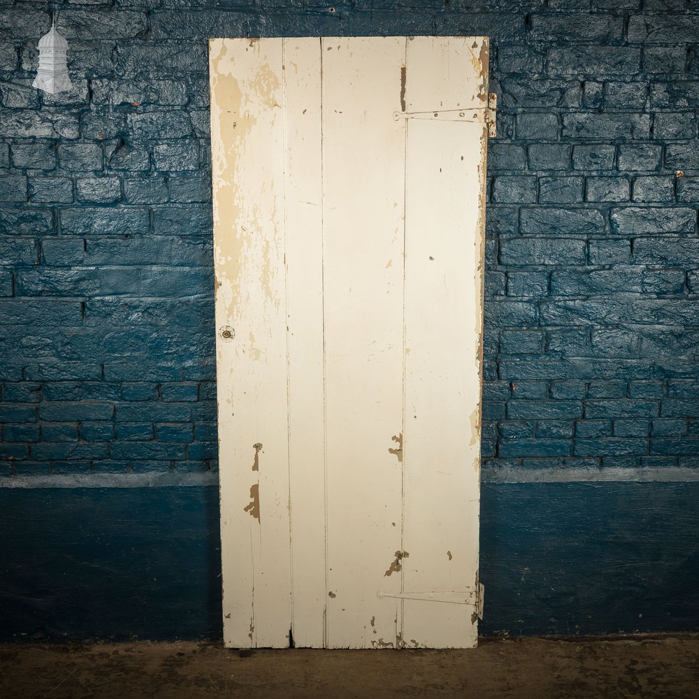 A reclaimed 4 plank door with ledged supports featuring beadboard panels. Hinges present, latch not included. Holes from other removed hardware are present. Distressed white paint finish. The thickness given is measured at the ledge. Wear including knocks and scuffs is consistent with age. Please use the listing photos to assess condition as a reclaimed item.