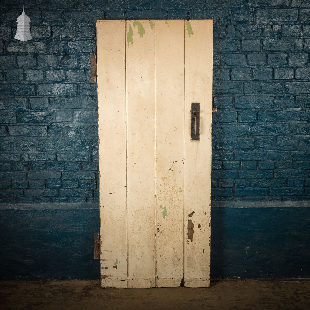 A reclaimed 4 plank door with ledged supports. Latch and hinges present. Distressed cream paint finish. The thickness given is measured at the ledge. Wear including knocks and scuffs is consistent with age. Please use the listing photos to assess the condition of this reclaimed item.