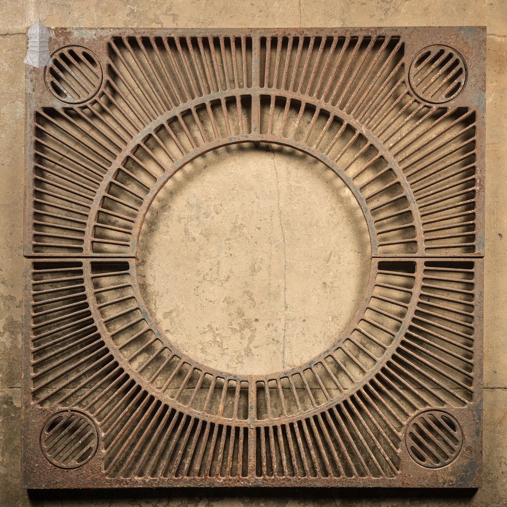 A reclaimed two-part cast iron pavement root guard for trees. These guards protect tree roots from damage caused by foot traffic and surface wear, guiding roots downward to ensure the tree remains healthy while preventing uneven or lifted pavements.