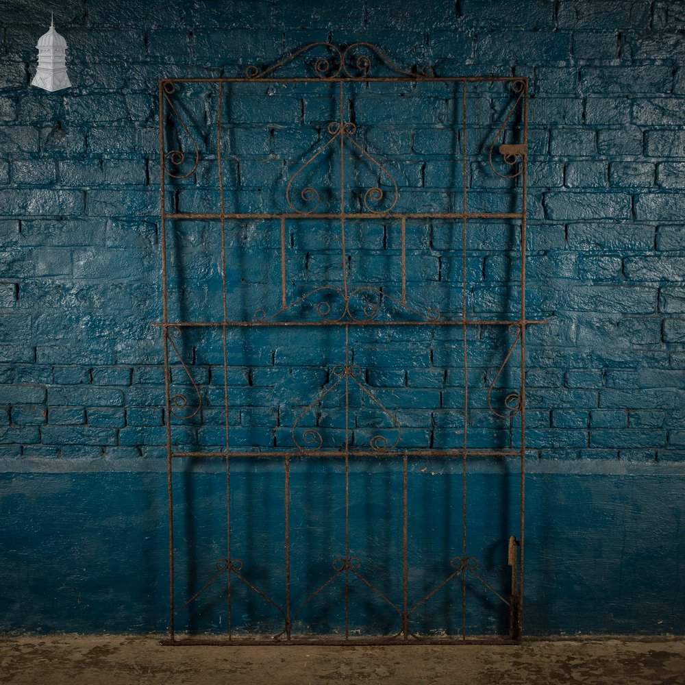 A wrought iron pedestrian gate with scrollwork design and drop bolt. Surface rust and wear and tear consistent with age.