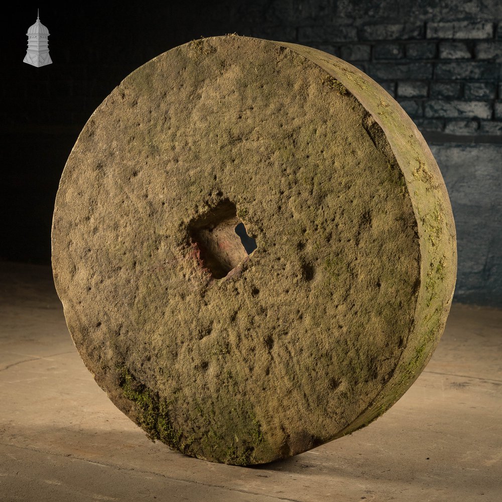 A reclaimed 27" grindstone (often mistaken for a millstone) with a weathered surface and a roughly square central drive hole. Traditionally, millstones were used to grind grain into flour, while grindstones served to sharpen tools and blades. This piece makes a striking addition to a garden border or can be repurposed as a water feature. See images for condition.