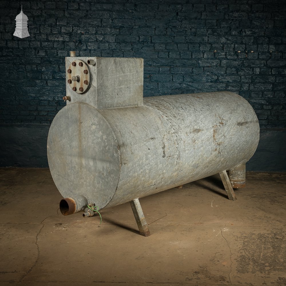 Approximate capacity 800 litres. Fabricated from galvanised steel raised on supporting legs. Several original pipe connections remain in place including a large inlet / outlet at the front of the cylinder along with a with a bolted circular inspection plate and another below to the rear.