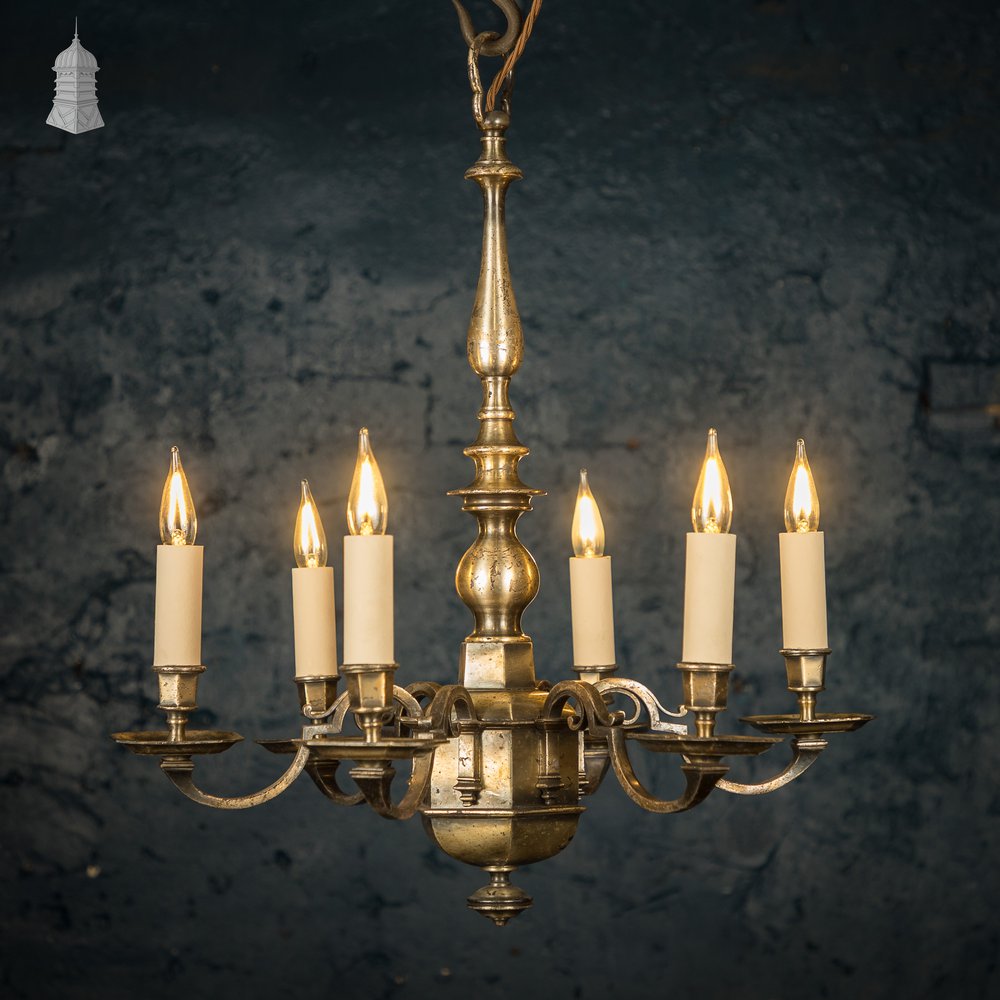 A traditional six light brass candle chandelier of single tier form. The design follows earlier candle chandeliers and retains the character of an original fitting that has later been converted for electric use.