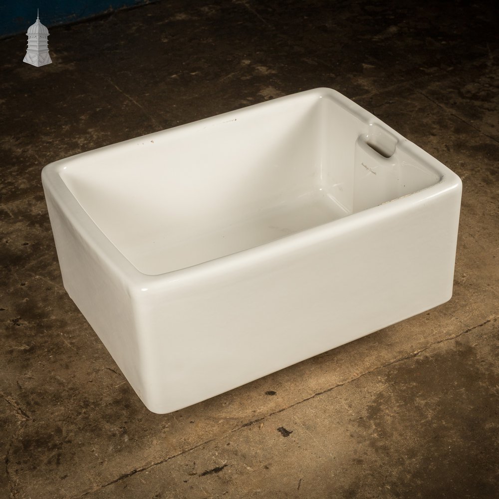Reclaimed classic white ceramic farmhouse style sink, featuring a weir overflow. Sometimes also referred to as a Belfast sink, it shows typical age-related wear, with a larger area of glaze loss to one inside rim clearly visible in the images. The sink pictured is the exact item for sale, with price reflecting its individual condition.