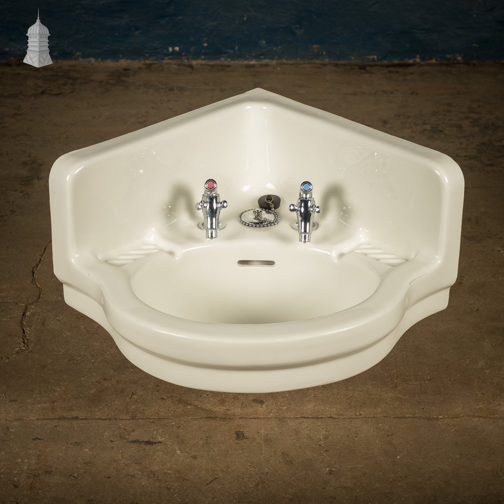 A reclaimed traditional-style white glazed corner basin, designed to fit neatly into a 90-degree corner, making it ideal for smaller bathrooms or cloakrooms. Fitted with a pair of Supataps, popular in the 1950s and 1960s, offering a cost-effective and low-maintenance alternative to standard taps. Please check the images to assess the condition of the basin.