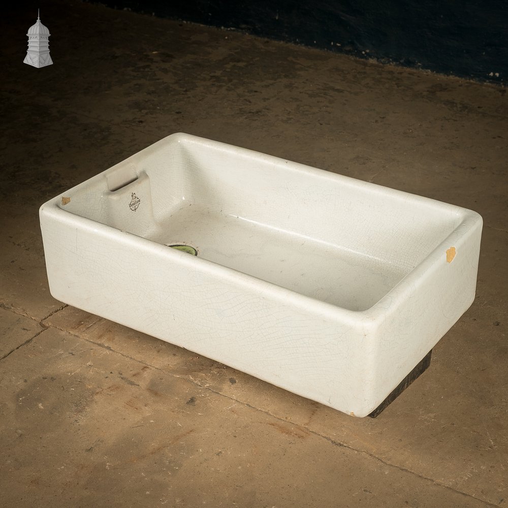 Reclaimed Royal Doulton Belfast Sink with Weir Overflow. A ceramic Belfast sink made by Royal Doulton. Fitted with a weir overflow for controlled drainage. Deep rectangular bowl with straight sides. Based on the maker's mark this sink dates to approximately 1907. Suits kitchen, utility, or workshop use. Wide rim allows stable fixing to worktops or timber supports. The glaze shows significant crazing across the surface. This reflects age and use. A couple of chips sit around the rim as shown in the images. The structure remains solid. Original form and proportions make it a good fit for period interiors. Would also work well as a garden planter. The sink in the images is the actual item for sale. The price reflects the age and condition of the item. Please use the listing images to assess the condition of this reclaimed item.